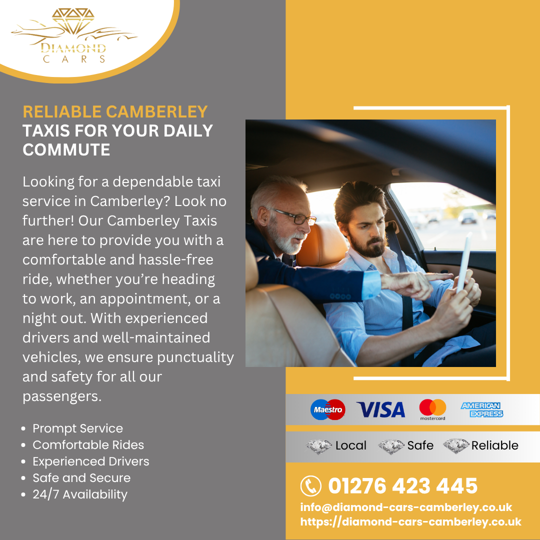 Enjoy premium travel with Diamond Cars Camberley, your trusted provider of reliable and comfortable transportation in Camberley and beyond. Whether you’re heading to the airport, attending an event, or need a quick local ride, our professional drivers and modern fleet guarantee punctuality, safety, and convenience every time. Available 24/7 with simple online booking, Diamond Cars Camberley makes every journey smooth, stress-free, and affordable.