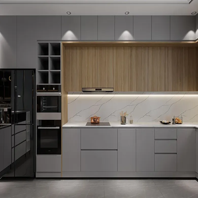 High-quality materials such as marine plywood, MDF, or HDF with waterproof and termite-resistant finishes are ideal. Countertops made from granite or quartz provide durability, while premium laminates or acrylic finishes add a modern aesthetic.